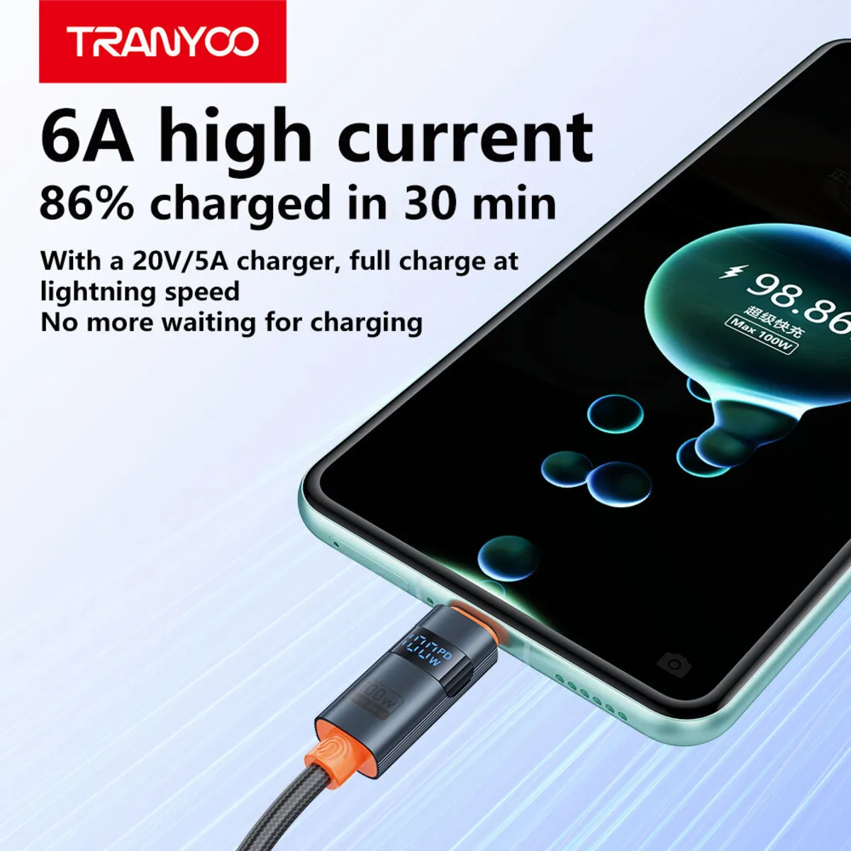تصور کنید که تنها 30 دقیقه زمان دارید و باتری گوشی شما در آستانه اتمام است. با کابل AC-6 TRANYOO، در همین زمان کوتاه، باتری دستگاه شما تا 86 درصد پر میشود. این ویژگی در مواقع اضطراری، سفرهای کوتاه یا بین جلسات کاری کاریزی، یک موهبت واقعی است.
