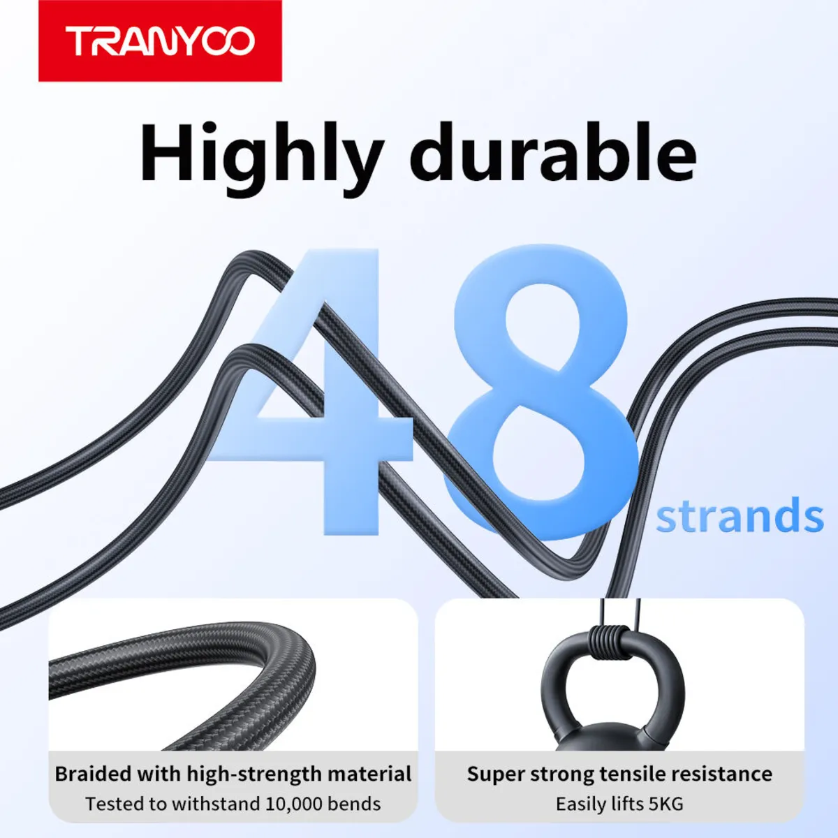 مقاومت کششی فوقالعاده: کابل AC-6 TRANYOO به راحتی میتواند وزنی معادل 5 کیلوگرم را تحمل کند. این ویژگی احتمال پارگی تصادفی کابل در اثر کشیدگی را به صفر نزدیک میکند.