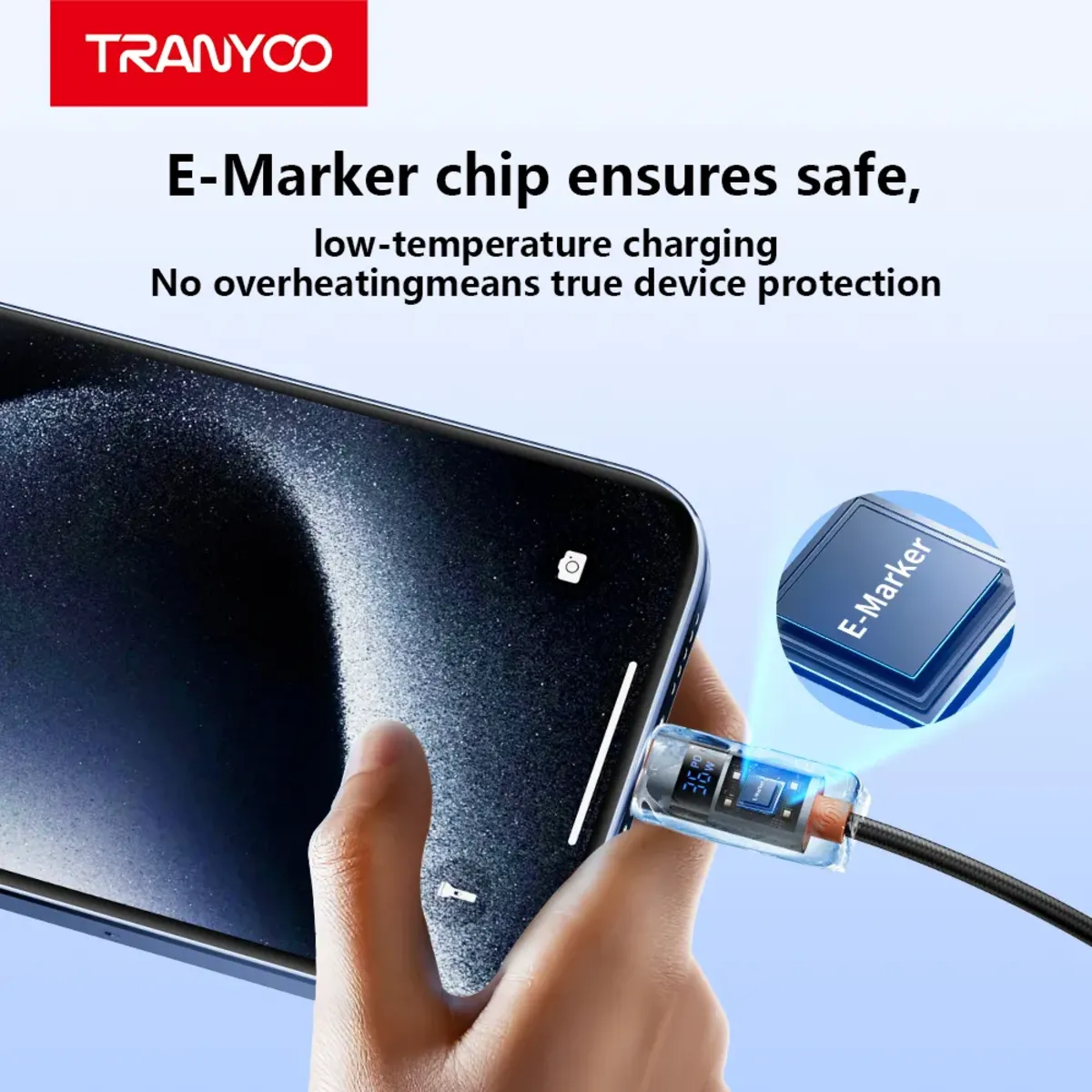 کابل Tranyoo CL-6 از سری کابلهای پرچمدار این برند است که با طراحی بادوام، فناوری شارژ سریع و تراشه هوشمند E-Marker تولید شده. این کابل مخصوص کاربرانی است که به سرعت شارژ بالا، ایمنی کامل و عمر طولانی کابل اهمیت میدهند. علاوه بر این، وجود یک نمایشگر دیجیتال روی کانکتور باعث شده کاربر بتواند در لحظه توان و جریان شارژ را مشاهده کند؛ قابلیت جذابی که در کمتر کابلی دیده میشود.